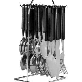 - Set of 24 seats six people and includes six forks, six knives, six tablespoons, six teaspoons and one storage rack.